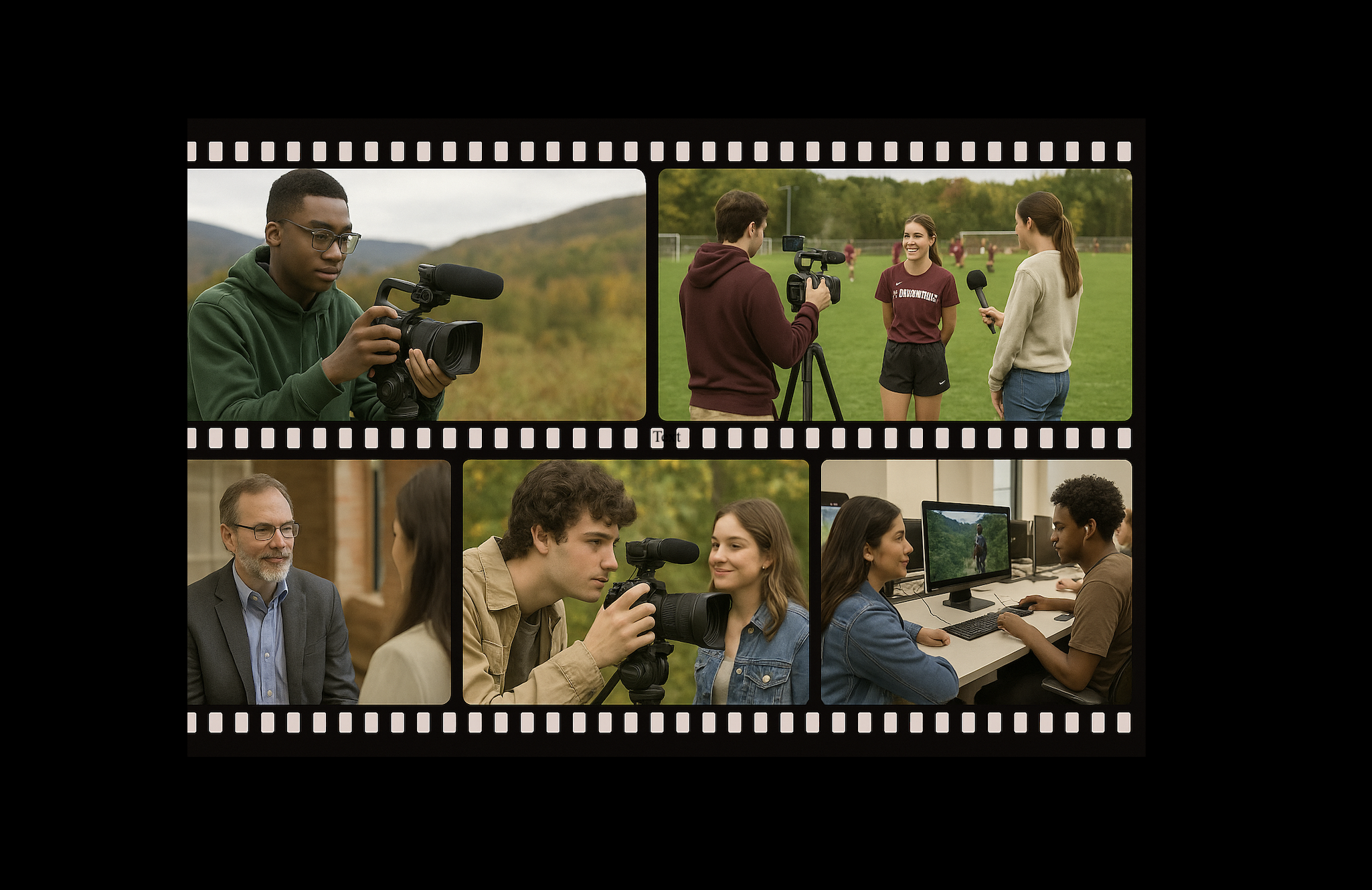 Create a 16:9 ratio composite image of five variously sized 16:9 ratio images of 17 to 19-year-old university students of different backgrounds filming outdoor nature scenes in the Allegheny Mountains and editing videos in a college campus computer lab, with each 16:9 image frame with sprocket-hole framing.